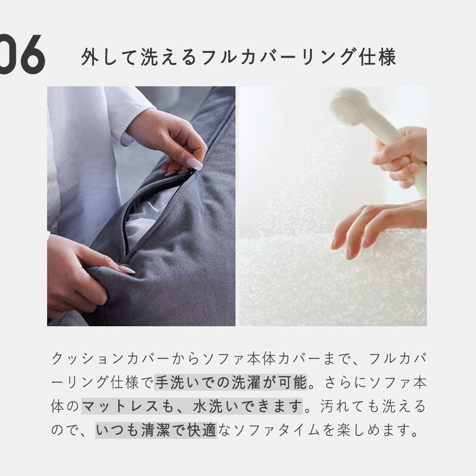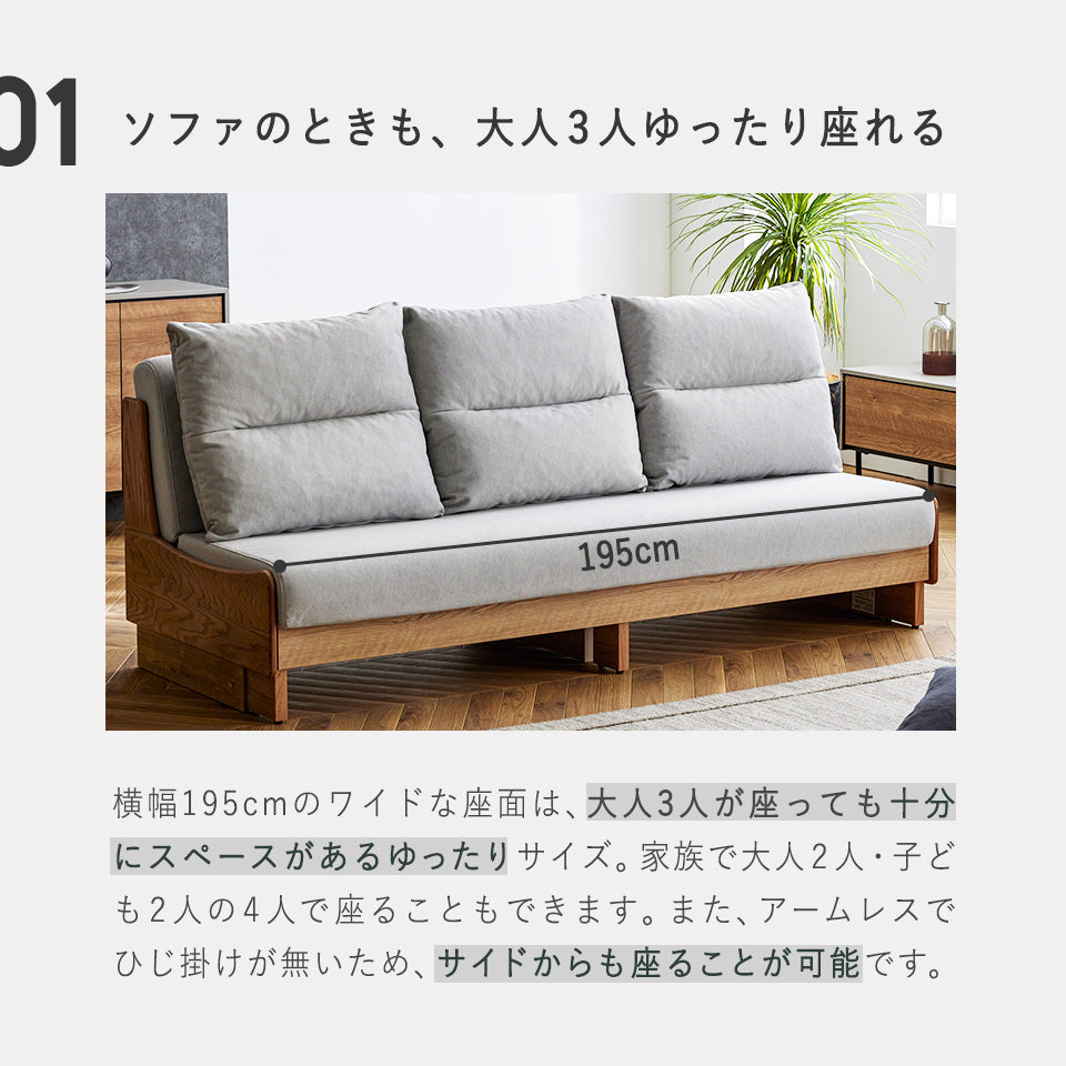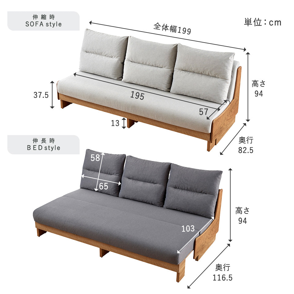[ ソファ時 ] 幅 : 199 × 奥行 : 82.5 × 高さ : 94 (cm) [ ベッド時 ] 幅:199 × 奥行:116.5 × 高さ:94 (cm) [ 置きクッション ] 幅:65 × 高さ:58 × 厚み:17 (cm) |